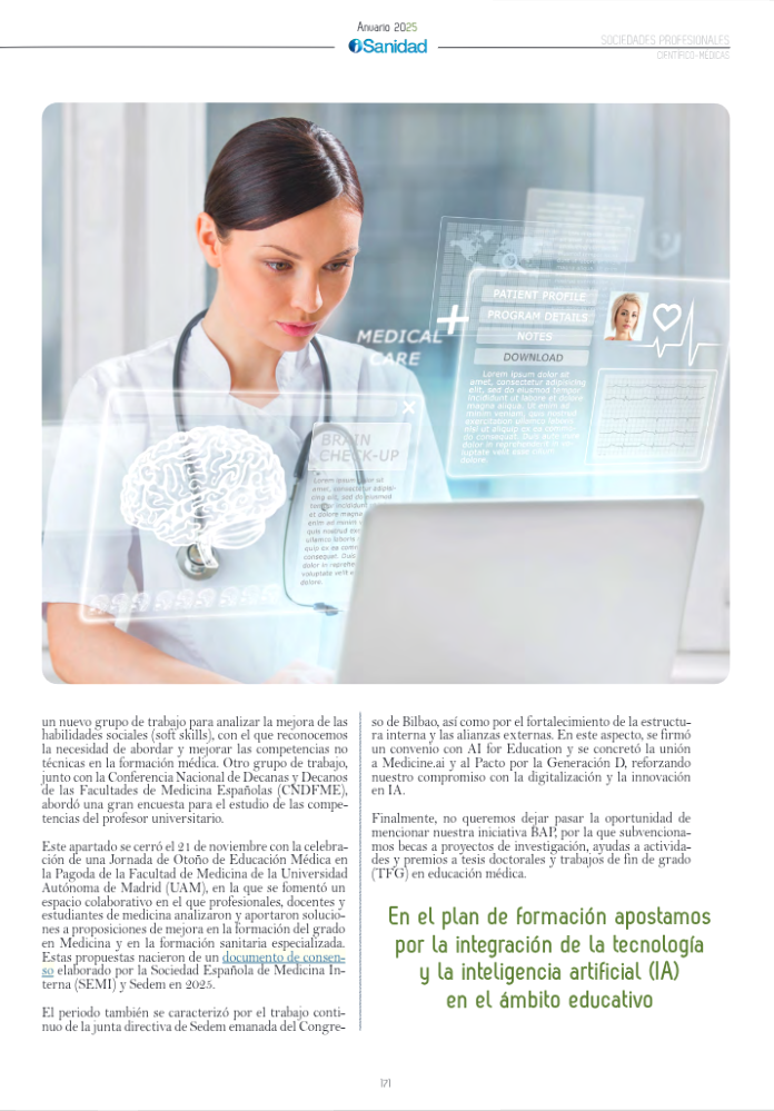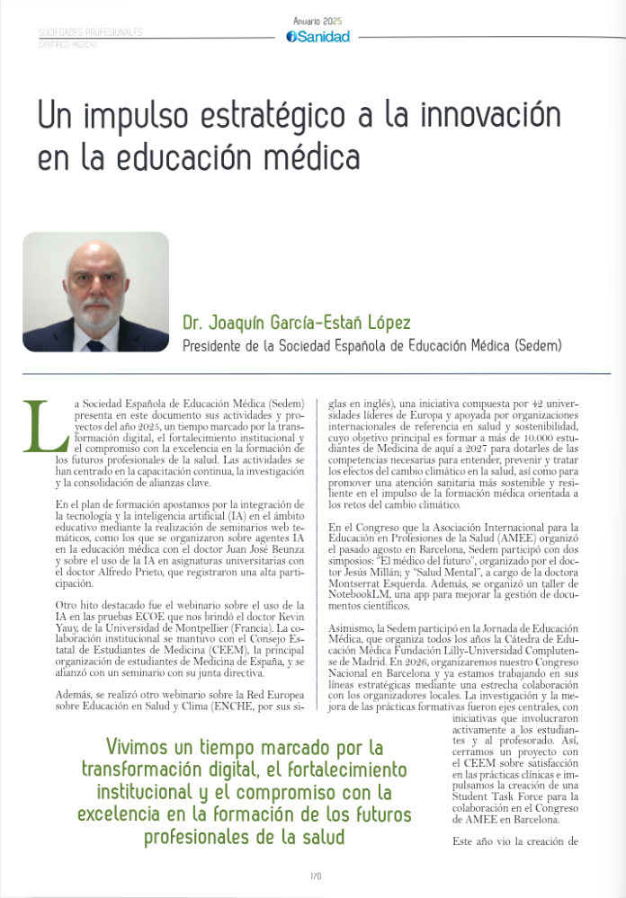 La Sociedad Española de Educación Médica y Ciencias de la Salud (SEDEM) ha desarrollado una intensa actividad centrada en la transformación digital, la integración de la inteligencia artificial en la docencia y el fortalecimiento institucional. A lo largo del año, se han impulsado iniciativas formativas como seminarios web sobre el uso de la IA en educación médica, su aplicación en asignaturas universitarias y en las pruebas ECOE, así como encuentros sobre salud y cambio climático en el marco de la Red Europea ENCHE. SEDEM también participó activamente en el Congreso AMEE celebrado en Barcelona con simposios dedicados al “médico del futuro” y la salud mental, además de promover talleres prácticos para mejorar la gestión del conocimiento científico.